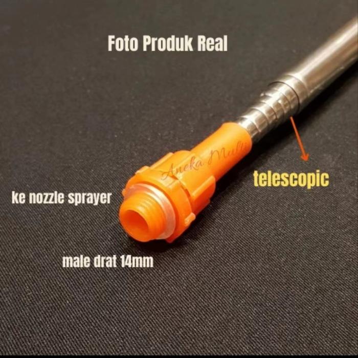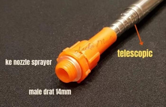 - Teleskopik: Merujuk pada sistem yang memungkinkan suatu benda (dalam hal ini pipa stik sprayer) untuk memanjang dan memendek seperti teropong, dengan cara menarik atau mendorong bagian-bagiannya.
