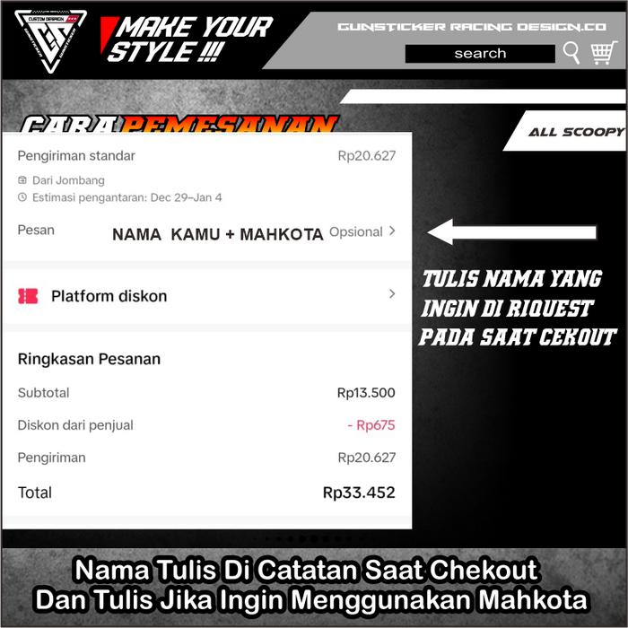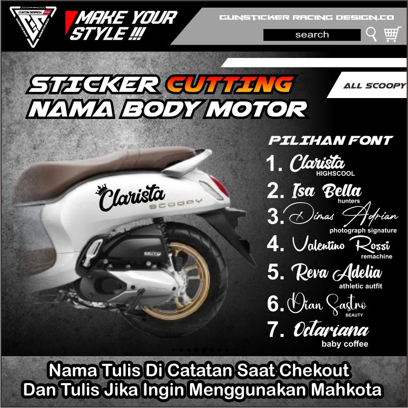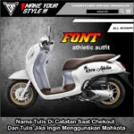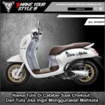 Pasang identitas pribadi pada motor Scoopy Anda dengan Stiker Nama Custom berkualitas tinggi. Stiker ini dibuat khusus untuk melengkapi gaya dan memberi kesan personal pada skutik Anda.
