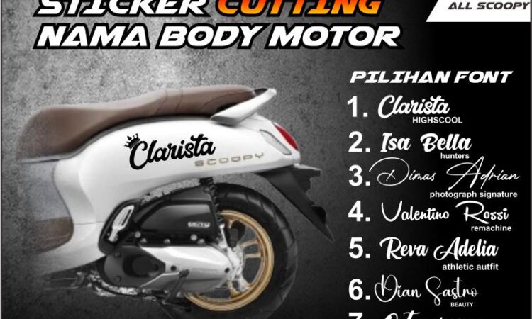 - Stiker Cutting: Jenis stiker yang dipotong khusus mengikuti bentuk dan outline dari desain (dalam hal ini, bentuk nama), bukan dicetak di atas bidang persegi. Hasilnya terlihat rapi dan menyatu dengan bodi motor.