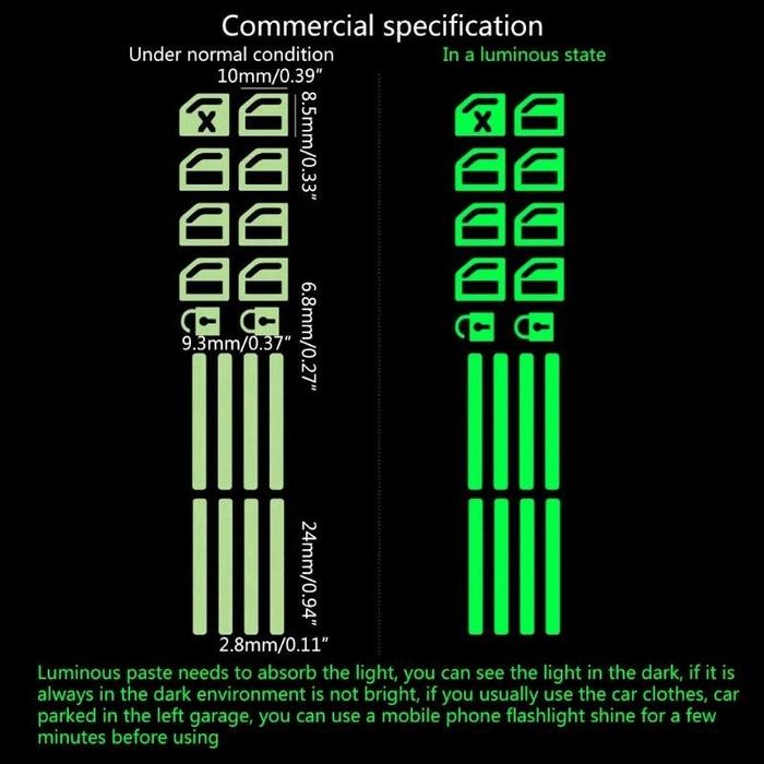 Temukan tombol kontrol kendaraan Anda dengan mudah, bahkan dalam kegelapan total! Stiker luminous kami adalah solusi praktis dan inovatif untuk meningkatkan pengalaman berkendara malam hari Anda. Dibuat dari bahan fluoresen berkualitas tinggi yang memiliki daya serap cahaya luar biasa, stiker ini akan menyala terang setelah menyerap cahaya dari sumber apa pun, seperti lampu mobil atau sinar matahari.