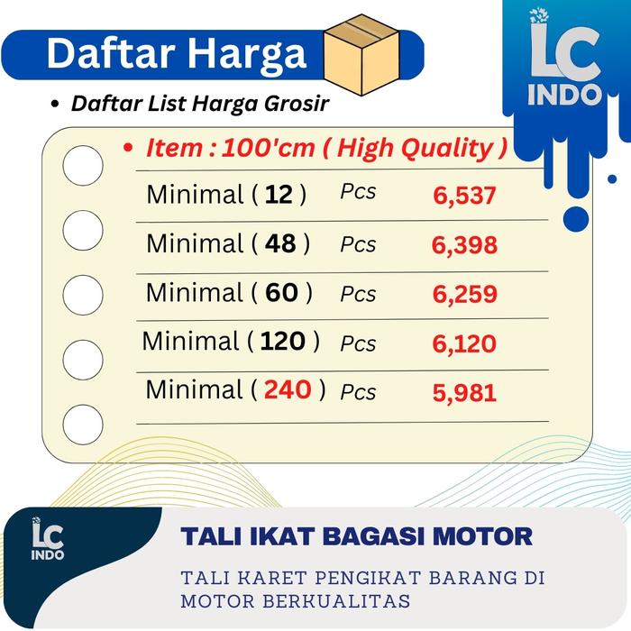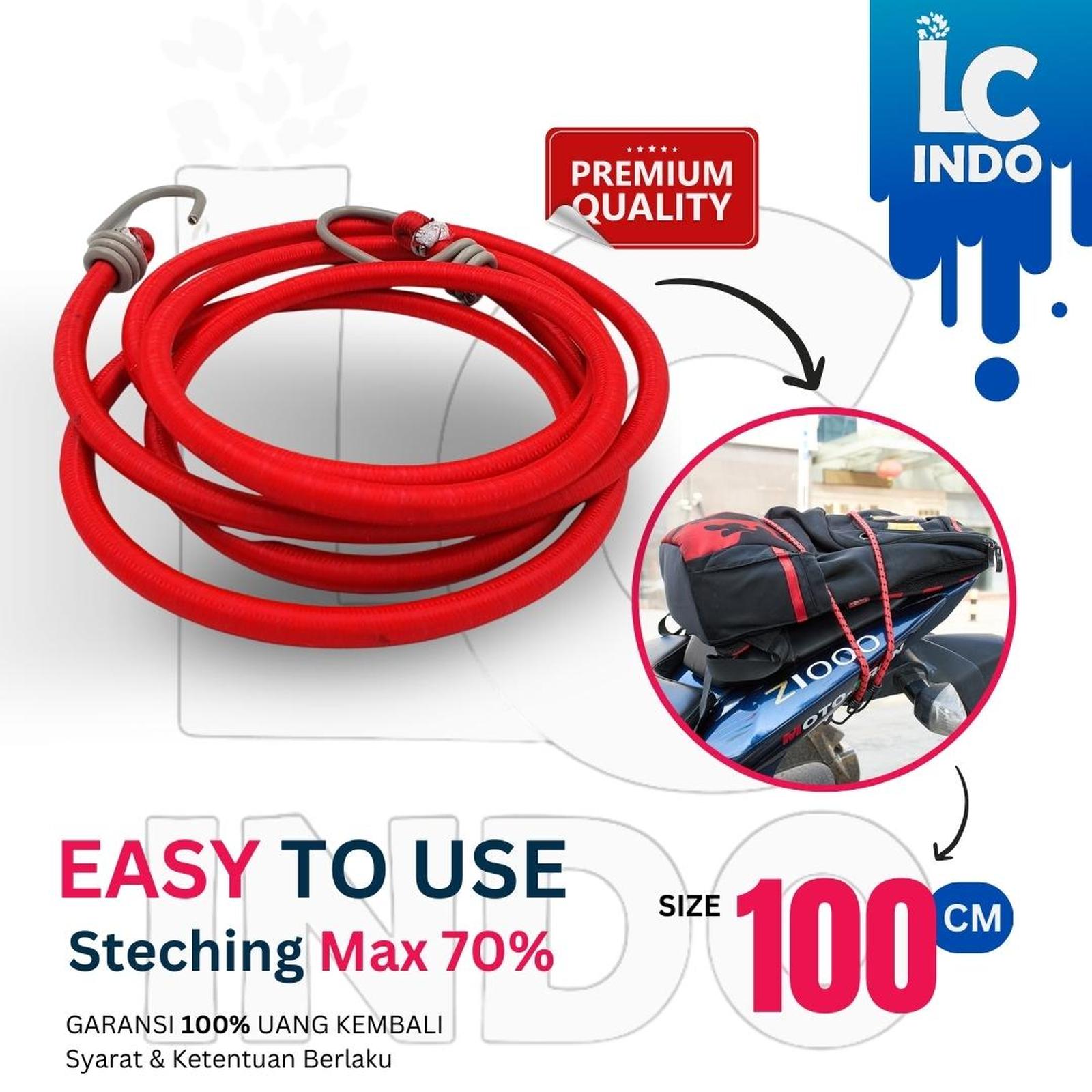 Strap tali bagasi motor ini dirancang khusus untuk mengamankan barang bawaan Anda dengan kuat dan praktis. Dengan panjang 100 cm (1 meter), tali ini terbuat dari material kombinasi 70% Latex dan 30% Polyester yang menjamin kelenturan serta daya cengkeram maksimal. Dibandingkan produk sejenis di pasaran yang hanya berdiameter 6mm, strap kami memiliki diameter 8mm sehingga lebih tebal, kuat, dan tahan lama.