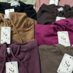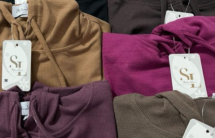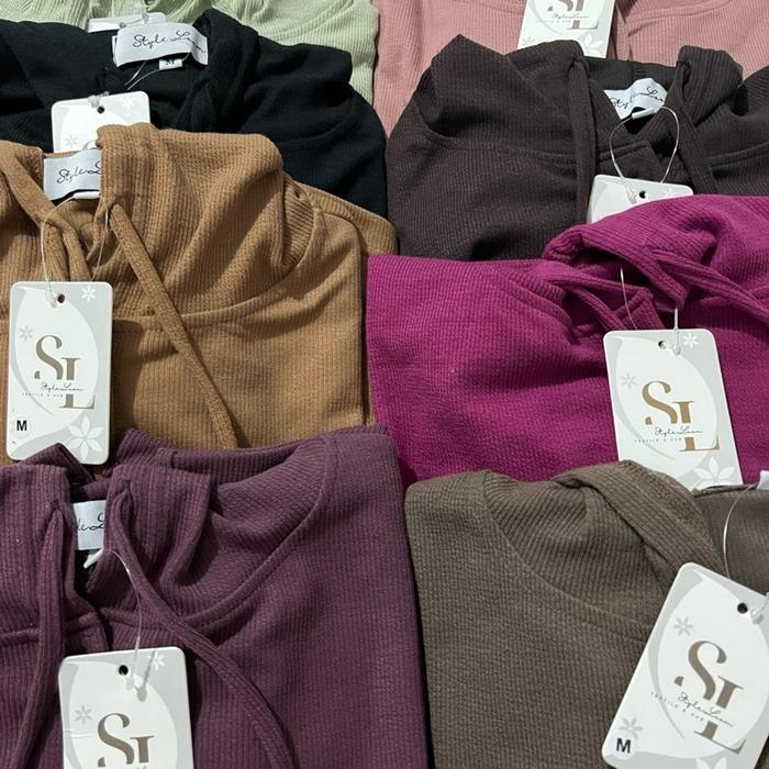 - Rib Knit: Jenis bahan rajutan yang memiliki tekstur berulang (seperti garis-garis vertikal) dengan elastisitas tinggi sehingga nyaman dan mudah mengikuti bentuk tubuh.