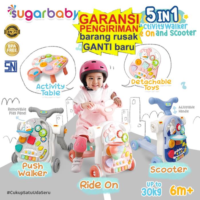 Warnai tumbuh kembang si kecil dengan mainan serbaguna yang dirancang untuk mendukung setiap tahapan perkembangannya. Sugarbaby 5in1 Activity Walker adalah solusi cerdas yang dapat berubah sesuai usia dan kebutuhan anak, dari mulai belajar duduk hingga mahir berlari.