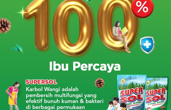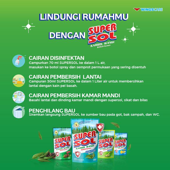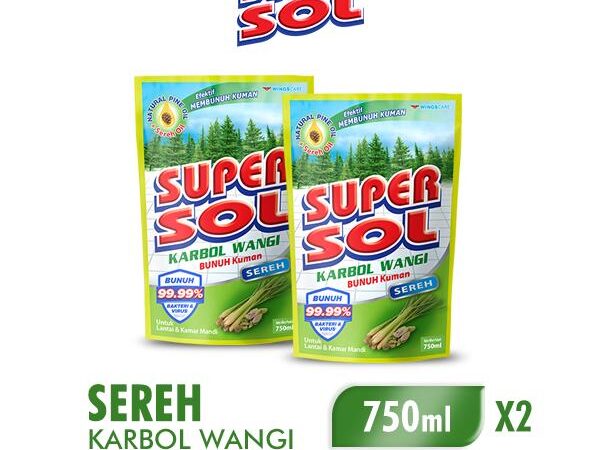 Jaga kebersihan dan kesegaran rumah secara maksimal dengan SUPERSOL Karbol Wangi Sereh. Formula multifungsinya yang diperkaya Pine Oil, Sereh Oil, dan BKC telah teruji secara klinis membasmi 99.99% kuman, virus, bakteri, dan jamur. Nikmati wangi sereh alami yang menyegarkan dan tahan lama hingga 4 jam setelah pembersihan.