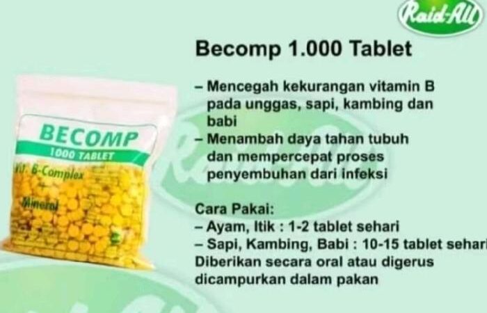 Tingkatkan kesehatan dan produktivitas ternak Anda dengan BECOMP Tablet. Suplemen Vitamin B-Complex dan Mineral ini dirancang khusus untuk mengatasi defisiensi vitamin B serta mendukung pertumbuhan optimal pada ayam, itik, kelinci, domba, kambing, dan sapi. Kandungan nutrisinya yang lengkap sangat efektif untuk meningkatkan nafsu makan, mempercepat pemulihan dari penyakit, dan menjaga stamina hewan ternak Anda.