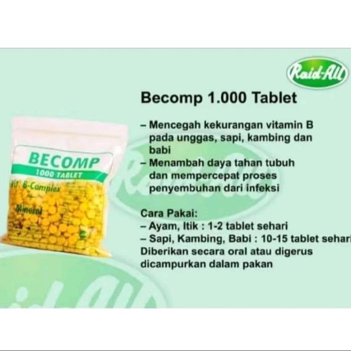 Tingkatkan kesehatan dan produktivitas ternak Anda dengan BECOMP Tablet. Suplemen Vitamin B-Complex dan Mineral ini dirancang khusus untuk mengatasi defisiensi vitamin B serta mendukung pertumbuhan optimal pada ayam, itik, kelinci, domba, kambing, dan sapi. Kandungan nutrisinya yang lengkap sangat efektif untuk meningkatkan nafsu makan, mempercepat pemulihan dari penyakit, dan menjaga stamina hewan ternak Anda.