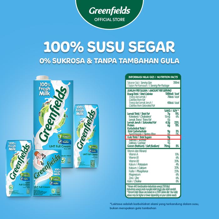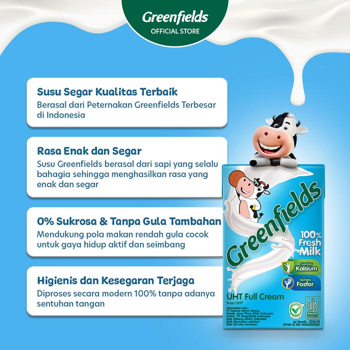 Rasakan kesegaran alami susu Full Cream dari Greenfields dalam kemasan 105 mL yang praktis. Dibuat dari 100% susu segar berkualitas tinggi dari peternakan sendiri yang dikelola secara profesional. Melalui proses pasteurisasi Ultra High Temperature (UHT), semua bakteri patogen telah dihilangkan sehingga susu memiliki usia simpan yang panjang, namun kandungan nutrisi alaminya tetap terjaga dengan sempurna.