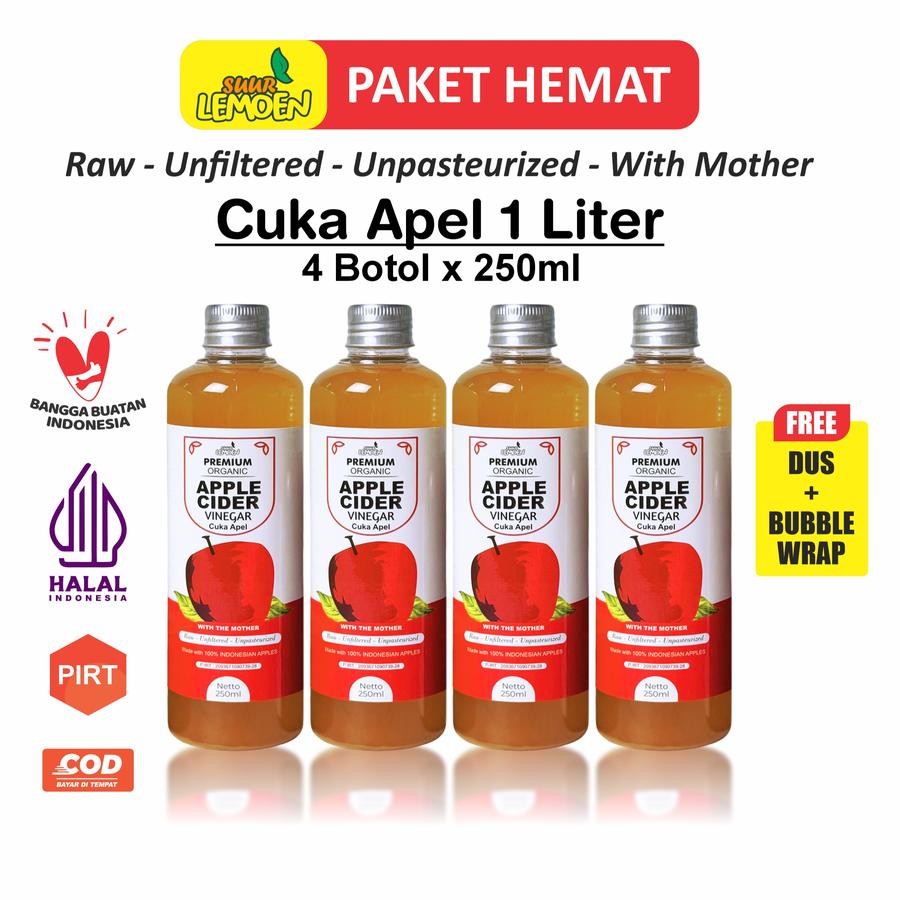- ‘The Mother’: Lapisan keruh alami dalam cuka apel yang mengandung bakteri probiotik, enzim, dan nutrisi hasil fermentasi. Berfungsi untuk menunjang kesehatan pencernaan dan metabolisme.