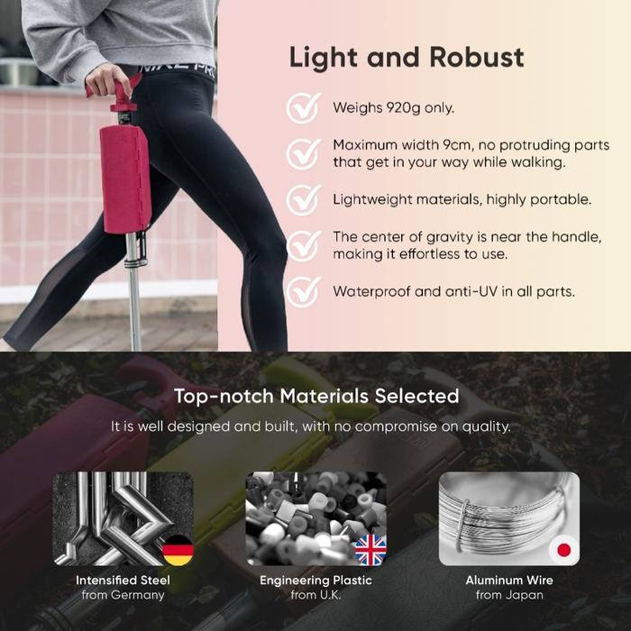 | Portabilitas | Ringan (hanya 0.92kg) dan praktis. Mudah dilipat dan dibawa dalam perjalanan jauh maupun aktivitas sehari-hari. |