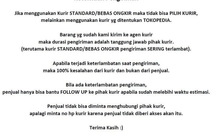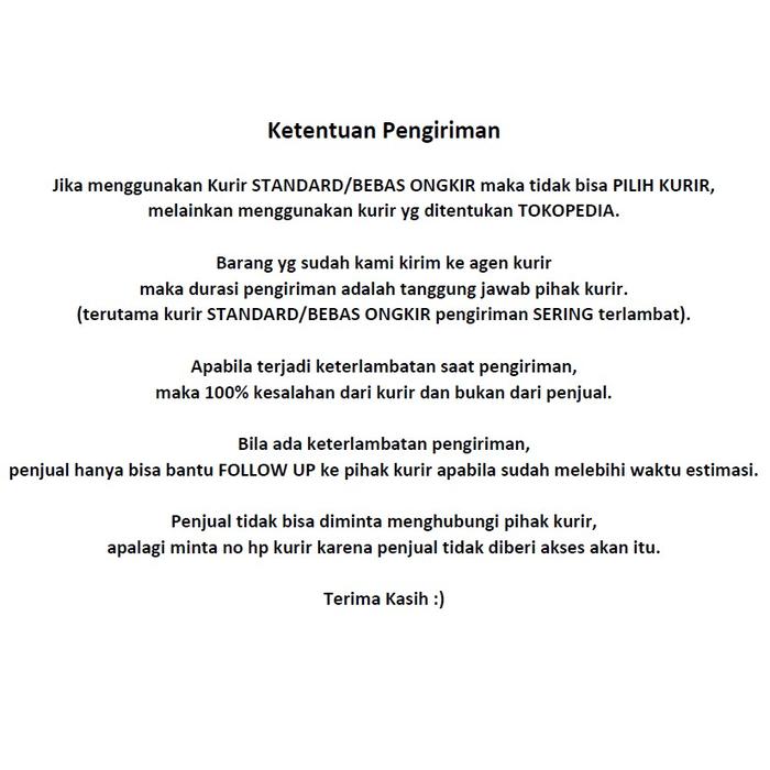 - Penggunaan kurir standard/bebas ongkir mengikuti ketentuan dan pilihan platform. Kami tidak dapat memilih kurir tertentu.