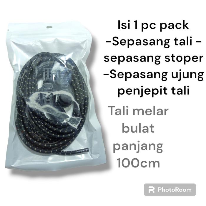 | Paket Pembelian | 1 pasang tali elastis bulat (panjang 100cm), 2 pasang stopper, 1 pasang penjepit ujung tali. |