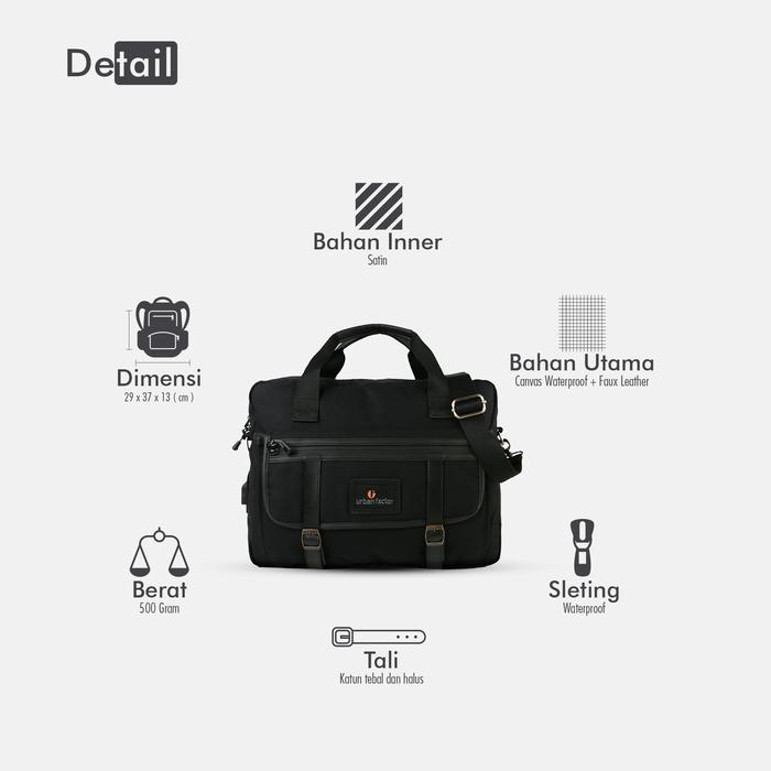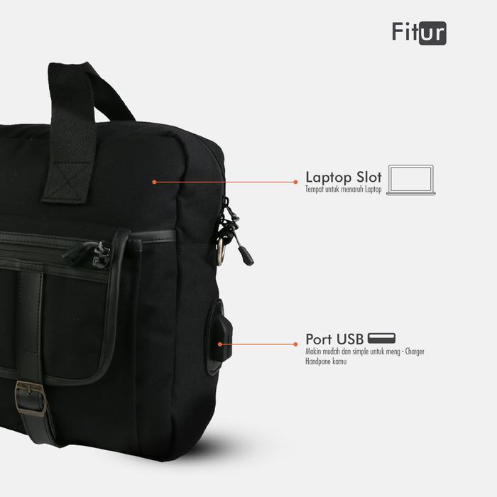 | Fitur | Port USB Charging, main compartment dengan slot laptop, saku depan multifungsi |