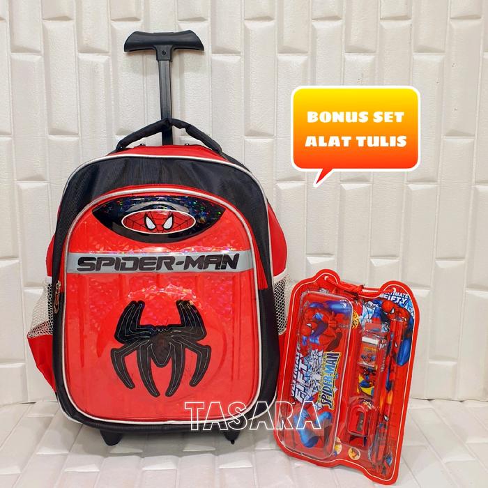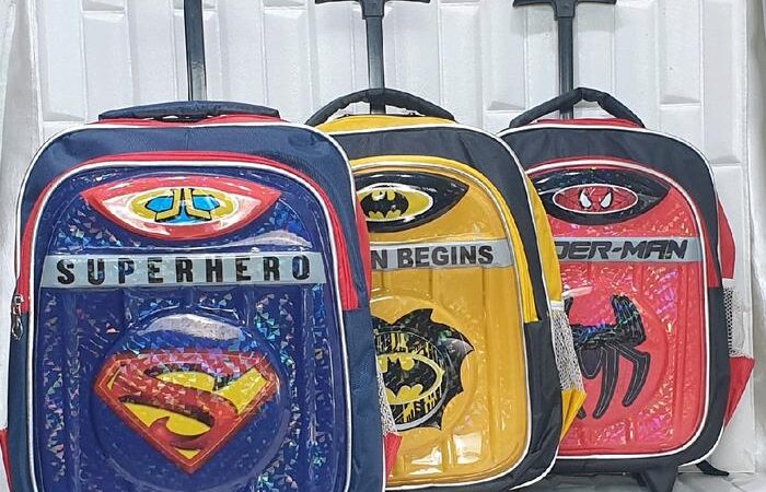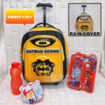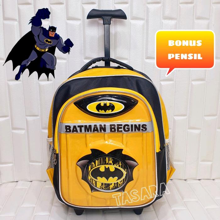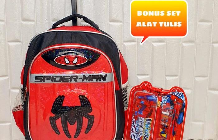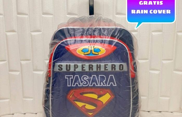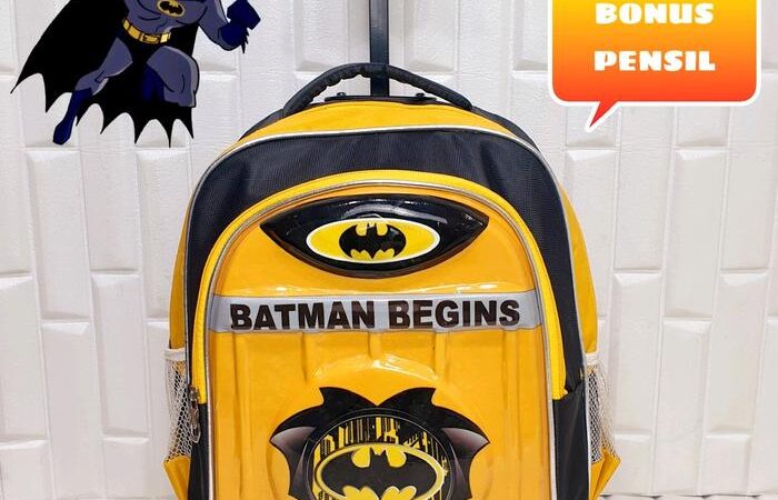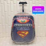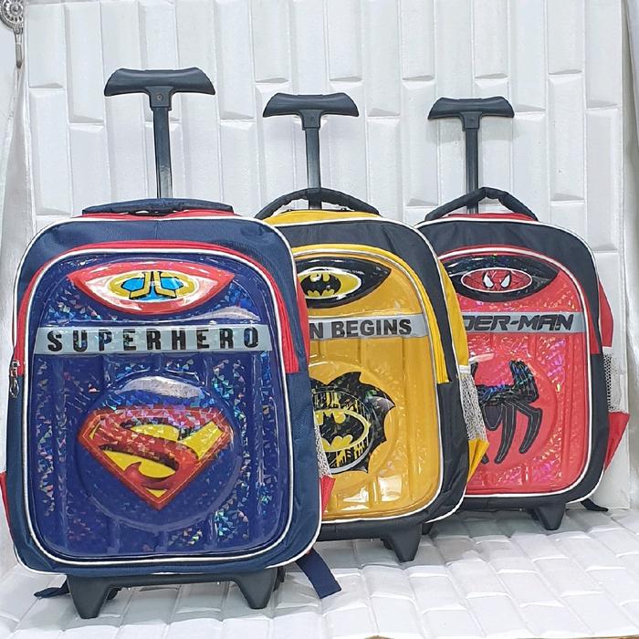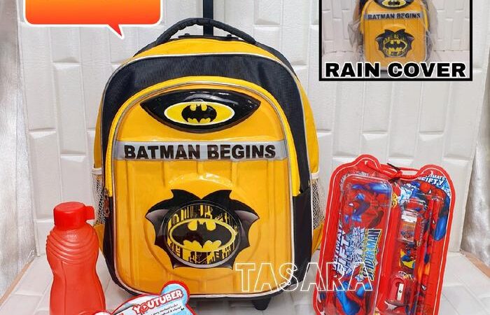 | Fitur | – Motif timbul 3D (Batman, Spiderman, Superman) dengan lampu LED – Dilapisi papan triplek tebal berbalut kain untuk kekuatan maksimal – 2 resleting (muat LKS/buku tulis) – Roda kuat & gagang ergonomis (random design) |