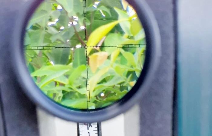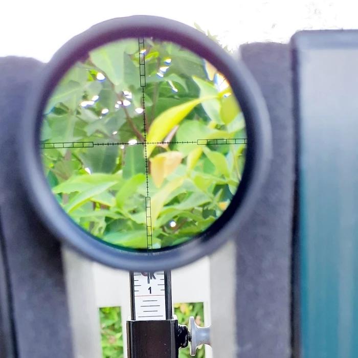 - Reticle 1/2 Mildot: Pola garis bidik (crosshair) yang memiliki titik-titik (dots) sebagai pedoman untuk memperkirakan jarak, mengkompensasi angin, dan menargetkan objek yang bergerak. 1/2 mildot berarti jarak antara titik-titik tersebut lebih rapat untuk pengukuran yang lebih presisi.
