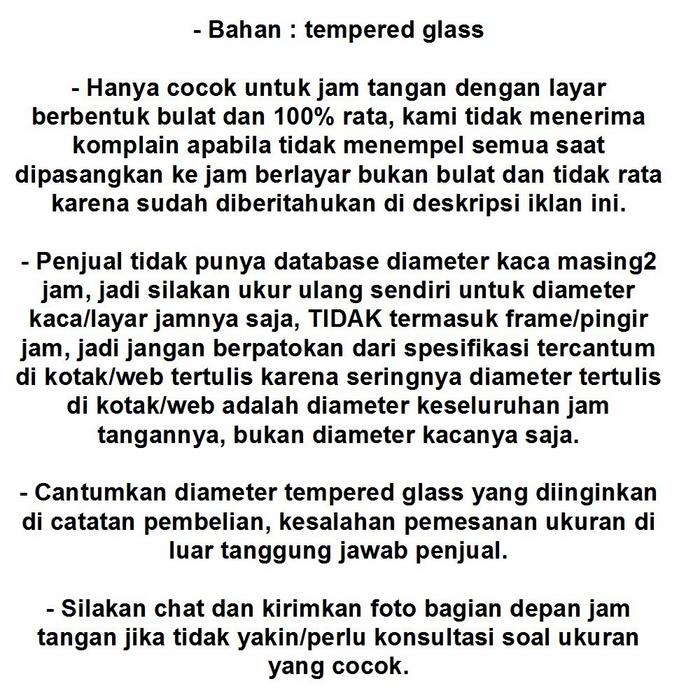 - Ukur sendiri diameter kaca/layar jam Anda (hanya bagian kacanya, tidak termasuk bingkai/bezel). Jangan mengandalkan diameter keseluruhan jam yang tercantum di spesifikasi produk atau kotaknya.