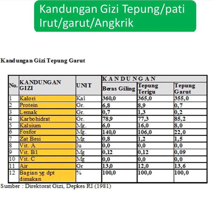 - Pati Garut: Tepung yang diekstrak dari umbi garut (arrowroot), dikenal sebagai pengganti tepung terigu yang lebih ringan dan mudah dicerna.