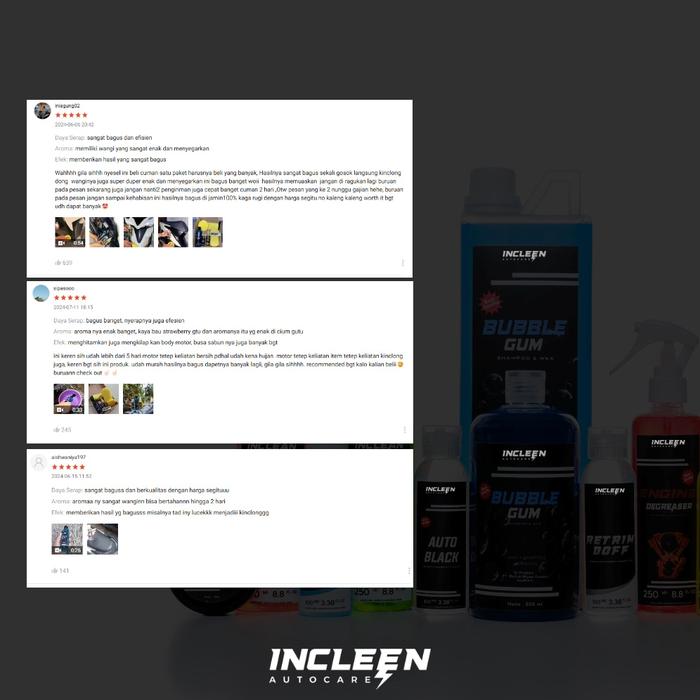 Raih kilau maksimal dan perlindungan ekstra untuk kendaraan Anda dengan INCLEEN Shampoo & Wax Bubble Gum. Formula canggih kami yang dilengkapi PH Balance dan kandungan wax alami tidak hanya membersihkan secara mendalam tetapi juga langsung memberikan lapisan pelindung yang mengkilap. Sangat efektif menghilangkan kotoran, debu, hingga bekas oli yang membandel.