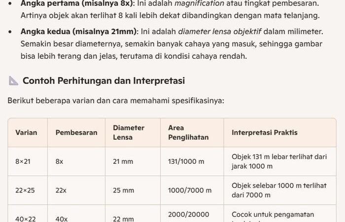 - Pembesaran (contoh: 8x): Menunjukkan seberapa besar objek diperbesar. Angka 8x berarti objek akan terlihat 8 kali lebih dekat.