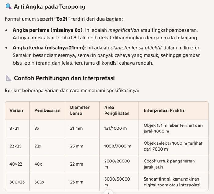 - Exit Pupil: Diameter berkas cahaya yang keluar dari lensa okuler (bagian yang ditempelkan ke mata). Semakin besar angkanya, gambar akan terlihat lebih terang, terutama dalam kondisi cahaya redup.