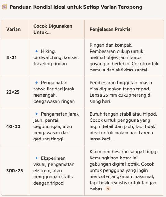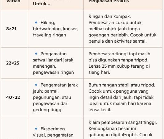| 8×21 | Ideal untuk hiking, birdwatching, konser, dan traveling. Ringan dan kompak. Pembesaran 8x cukup untuk melihat objek jauh dengan stabil tanpa goyangan berlebih. Cocok untuk pemula dan aktivitas sehari-hari. |
