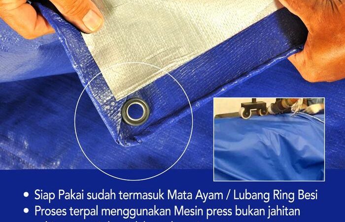 | Warna & Finishing | Dua sisi (Biru-Silver), dilengkapi Mata Ayam/ring besi di setiap sudut, siap pakai. |