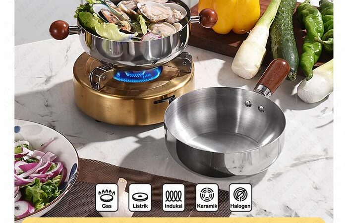 - Saucepan: Panci dengan tinggi lebih dari diameter, biasanya dilengkapi dengan gagang panjang dan tutup. Sangat cocok untuk membuat saus, merebus, atau memanaskan cairan dalam jumlah kecil hingga sedang.