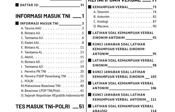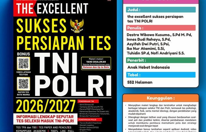 Siapkan dirimu untuk meraih karier cemerlang sebagai Prajurit TNI atau POLRI. Buku ini adalah panduan komprehensif dan solusi tepat untuk membantu kamu menguasai semua tahapan seleksi penerimaan. Mulai dari seleksi administrasi, tes akademik, psikotes, tes kesehatan, hingga tes kesamaptaan (kebugaran fisik) dibahas secara detail untuk memastikan persiapanmu maksimal dan terarah.