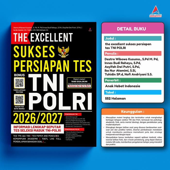 Siapkan dirimu untuk meraih karier cemerlang sebagai Prajurit TNI atau POLRI. Buku ini adalah panduan komprehensif dan solusi tepat untuk membantu kamu menguasai semua tahapan seleksi penerimaan. Mulai dari seleksi administrasi, tes akademik, psikotes, tes kesehatan, hingga tes kesamaptaan (kebugaran fisik) dibahas secara detail untuk memastikan persiapanmu maksimal dan terarah.