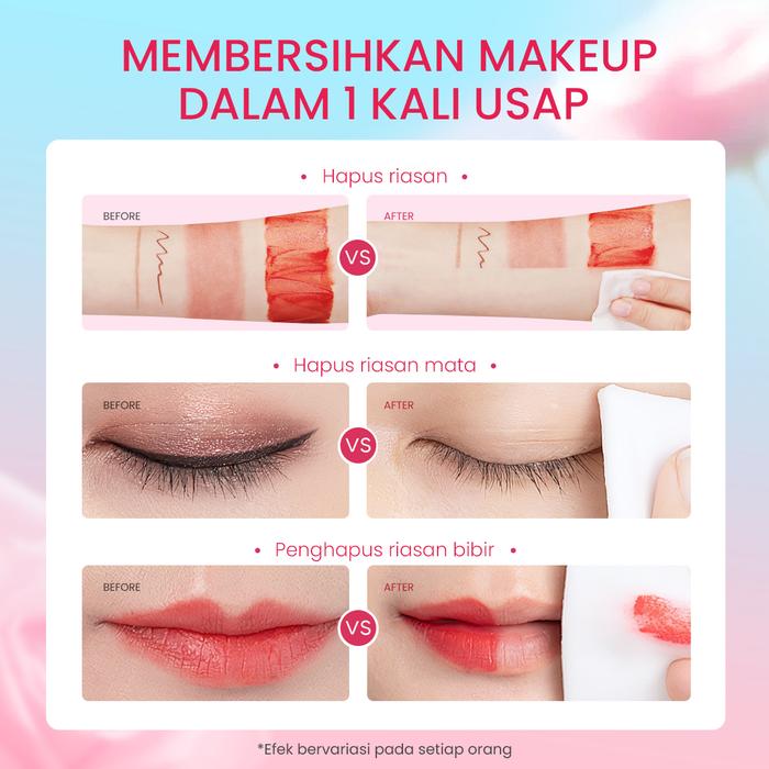 | Cara Penggunaan | Usap seluruh wajah dan area mata secara lembut hingga makeup terangkat. Gunakan kedua sisi tisu. Segera tutup rapat kemasannya setelah digunakan untuk menjaga kelembapan tisu. |