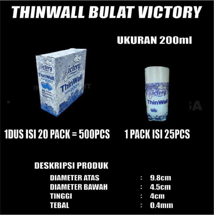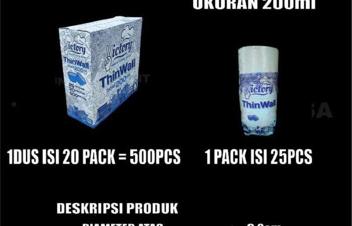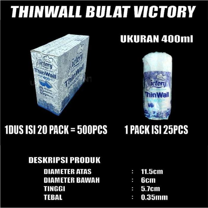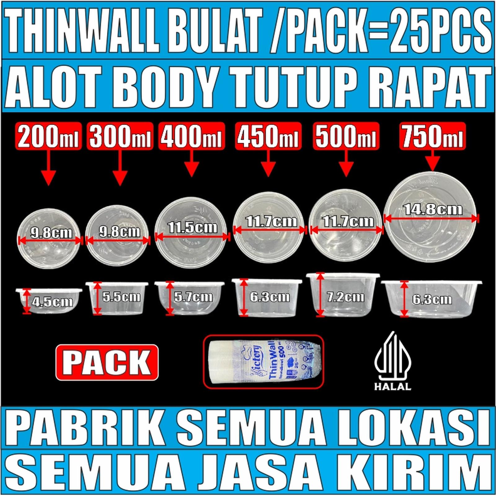Temukan kemasan makanan berkualitas tinggi dengan Thinwall Bulat Victory Pack. Tersedia dalam berbagai ukuran: 200ml, 300ml, 400ml, 450ml, 500ml, dan 750ml. Setiap pack berisi 25 pcs (body + tutup) dengan harga yang tertera untuk 1 pack.