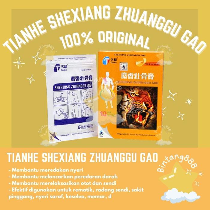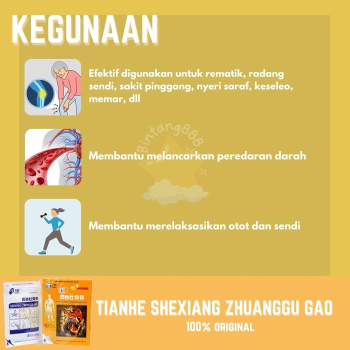 Tianhe Shexiang Zhuanggu Gao adalah koyo herbal berkhasiat yang diformulasikan untuk mengatasi berbagai keluhan nyeri pada tubuh. Koyo ini bekerja efektif membantu meredakan nyeri, melancarkan peredaran darah, serta merelaksasi otot dan sendi yang tegang. Sangat cocok digunakan untuk mengobati rematik, radang sendi, sakit pinggang, nyeri saraf, pegal linu, keseleo, dan memar.