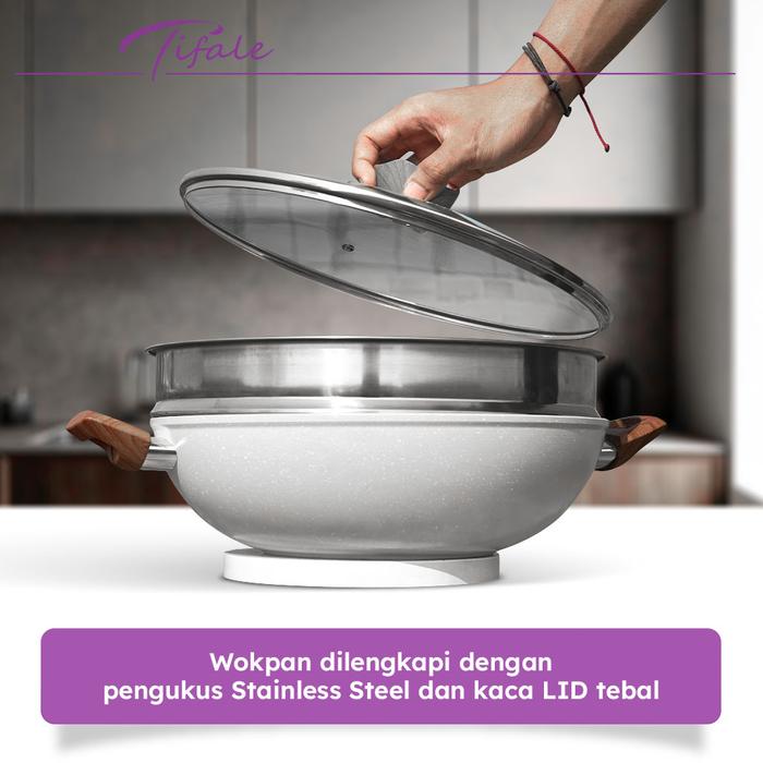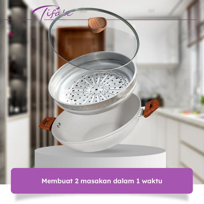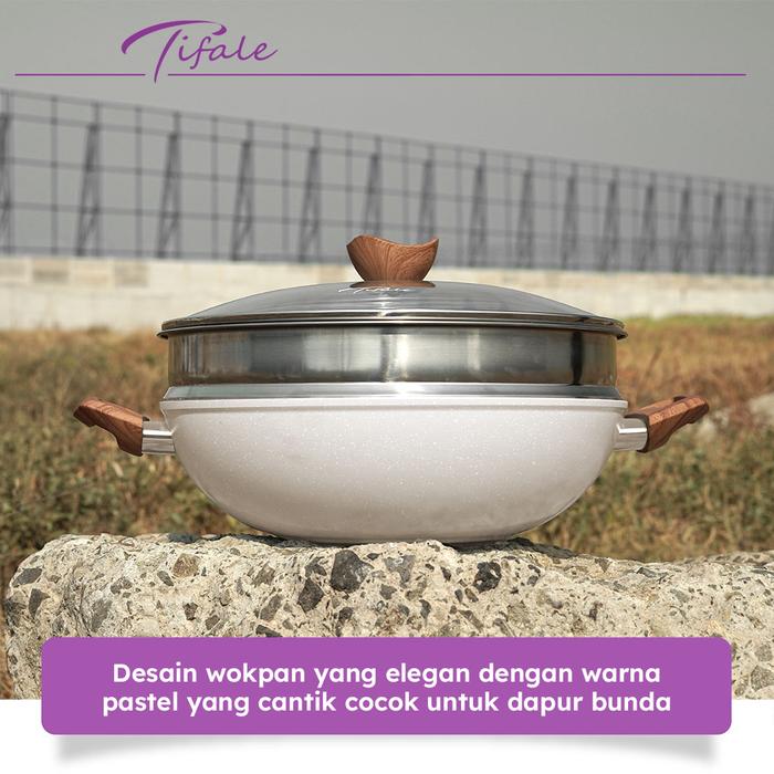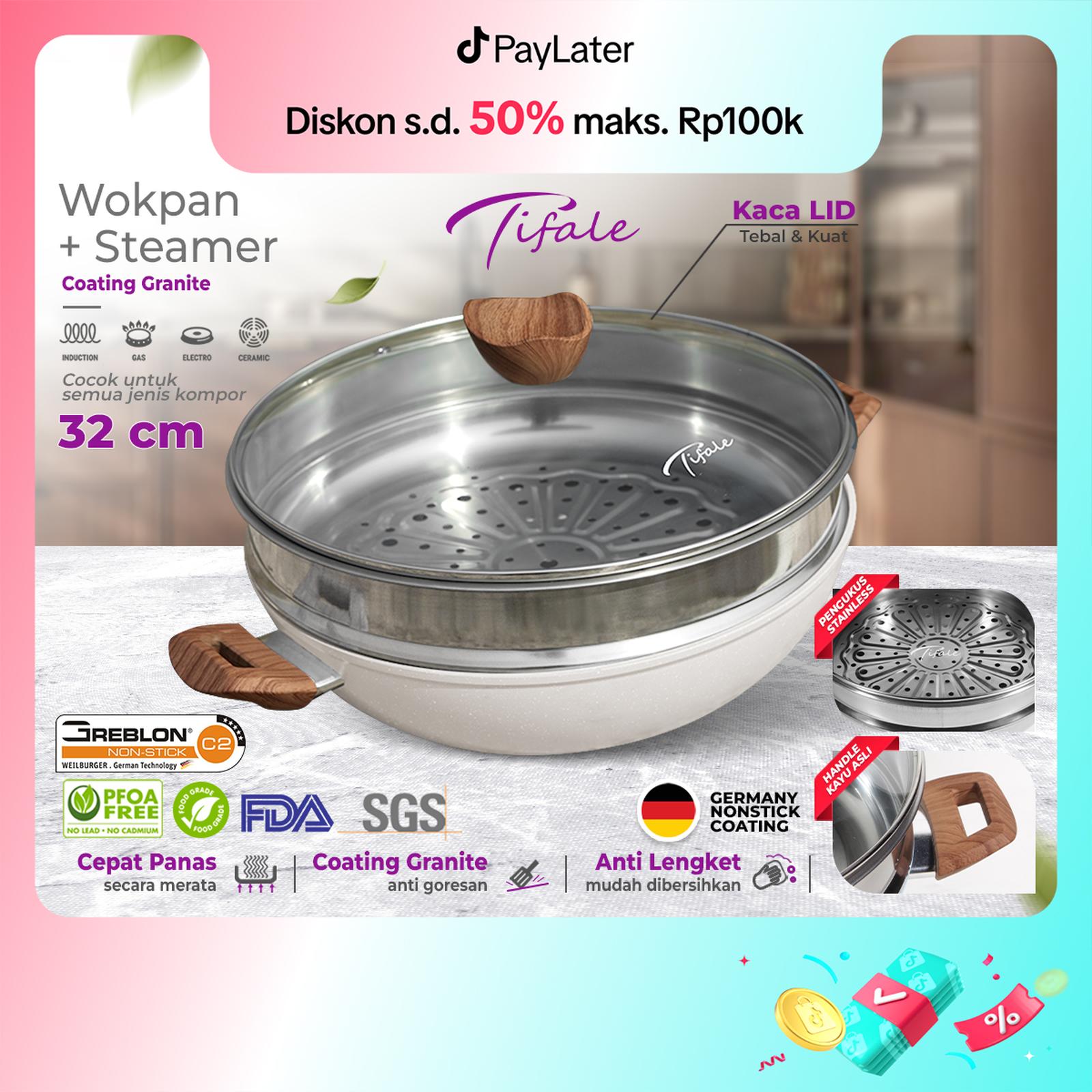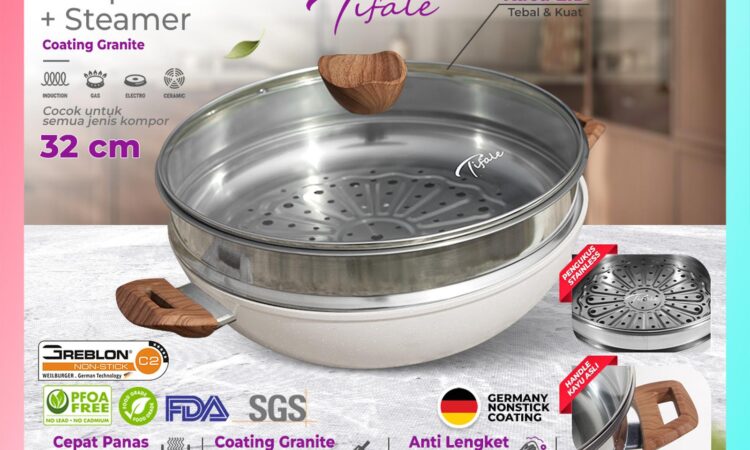Hadir dengan desain elegan dan warna pastel yang cantik, Tifale Wokpan 2in1 adalah solusi lengkap untuk memasak sehari-hari. Nikmati keunggulan wajan (wokpan) berdiameter 32cm yang dilengkapi dengan panci kukus (steamer) stainless steel dan tutup kaca tebal. Lapisan granite non-stick membuatnya anti lengket, sangat mudah dibersihkan, dan sehat untuk memasak dengan minyak sedikit.