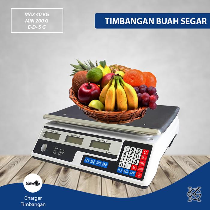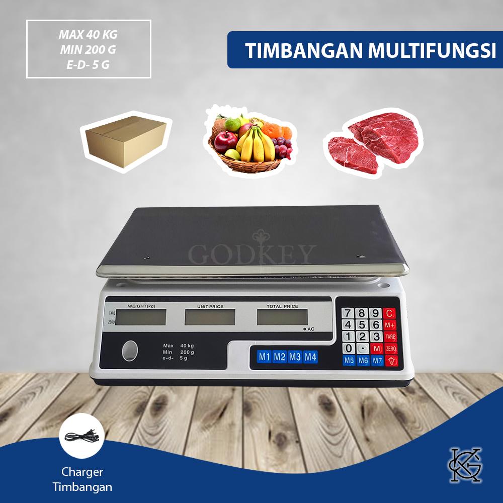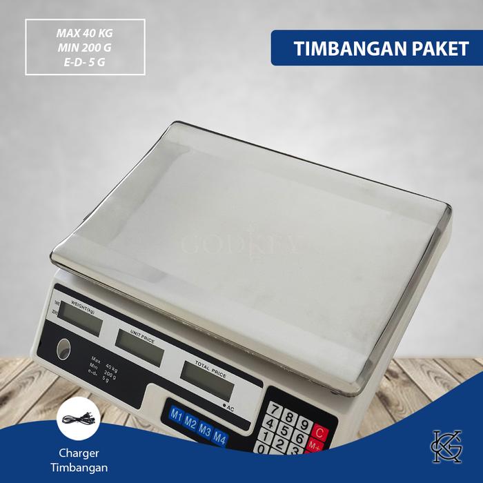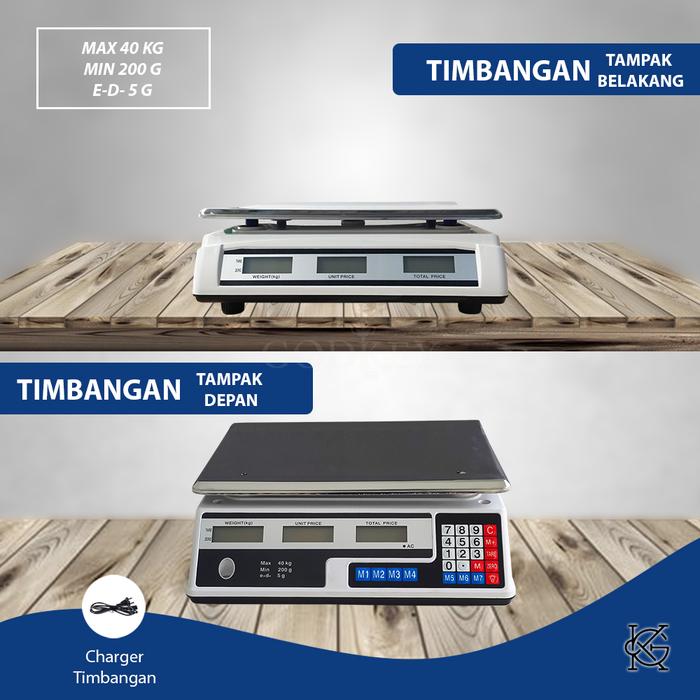 Timbangan digital serbaguna dengan kapasitas maksimal 40kg dan ketelitian hingga 5 gram. Dilengkapi dengan tiga layar LED hijau yang secara simultan menampilkan informasi berat (kg), harga satuan, dan total harga, sehingga sangat memudahkan proses penimbangan dan perhitungan. Platform timbangan yang luas (33cm x 23cm) cocok untuk menimbang benda berukuran besar seperti karung laundry, kardus sembako, keranjang telur, atau bahan-bahan dalam jumlah banyak untuk dapur dan industri rumahan.