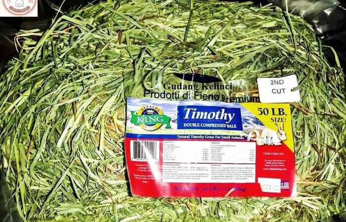 - Timothy Hay: Merupakan rumput kering yang menjadi komponen utama makanan bagi hewan herbivora seperti kelinci, marmut (guinea pig), dan chinchilla. Tinggi serat dan rendah protein serta kalsium, sangat baik untuk mendukung kesehatan sistem pencernaan dan mengikis gigi yang terus tumbuh.