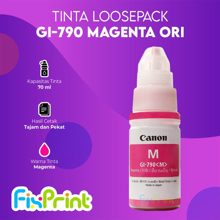 | Tinta Original Canon GI-790 Loosepack | • Produk diambil langsung dari unit printer baru. • Harga lebih ekonomis, kualitas sama dengan box. • Garansi uang kembali 100% jika terbukti palsu. | Canon G1000, G2000, G3000, G4000, G1010, G2010, G3010, G4010 |