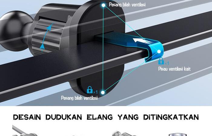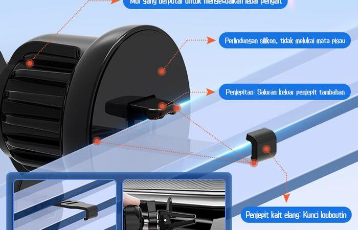 - Air Vent Suction: Sistem pemasangan dengan klip yang menjepit dan mencengkeram bilah ventilasi AC (air vent) pada dashboard mobil.