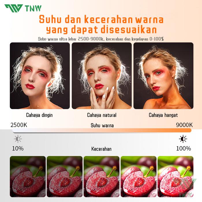 | 72 LED Berkualitas Tinggi | Menghasilkan cahaya yang soft dan natural dengan 3 mode (Cool, Warm, Warm-Cool) dan 10 level kecerahan yang dapat disesuaikan (3000K-9900K). |
