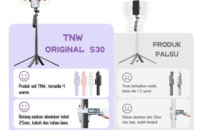Tingkatkan kreativitas fotografi Anda dengan TNW S30, tongsis serba bisa yang menggabungkan empat fungsi penting dalam satu desainan inovatif. Dengan tinggi maksimal 1.8 meter, perangkat ini didukung rangka paduan aluminium kuat dan sistem kaki empat (quadpod) untuk stabilitas maksimal, bahkan untuk smartphone berukuran besar dan berat.