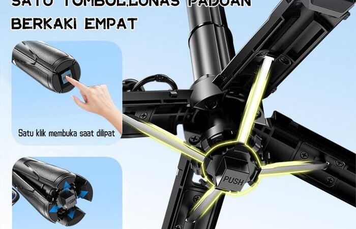 | Sistem Kaki One-Touch | Tekan satu tombol untuk membuka keempat kaki tripod secara otomatis. Desain kaki yang lebar dan material paduan logam menjamin stabilitas maksimal di berbagai permukaan. |