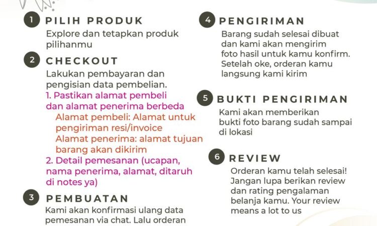 | Konfirmasi Pesanan | Kirim via chat dengan format: – Nama penerima – No. HP penerima – Alamat lengkap – Tanggal & waktu pengiriman |