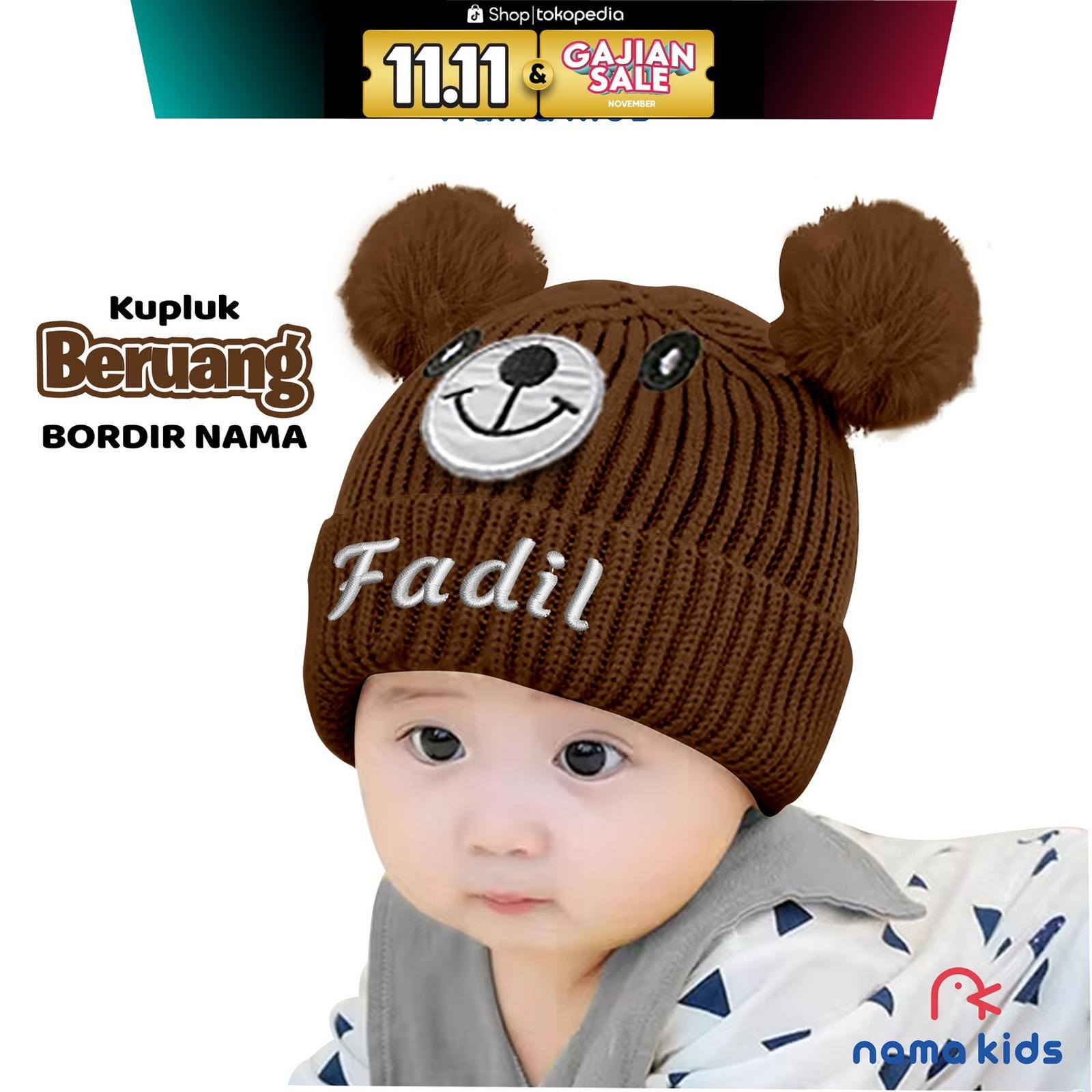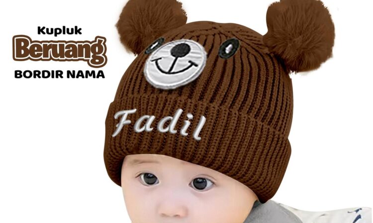 | Model | Kupluk bayi dengan pompom dan bordir karakter beruang |