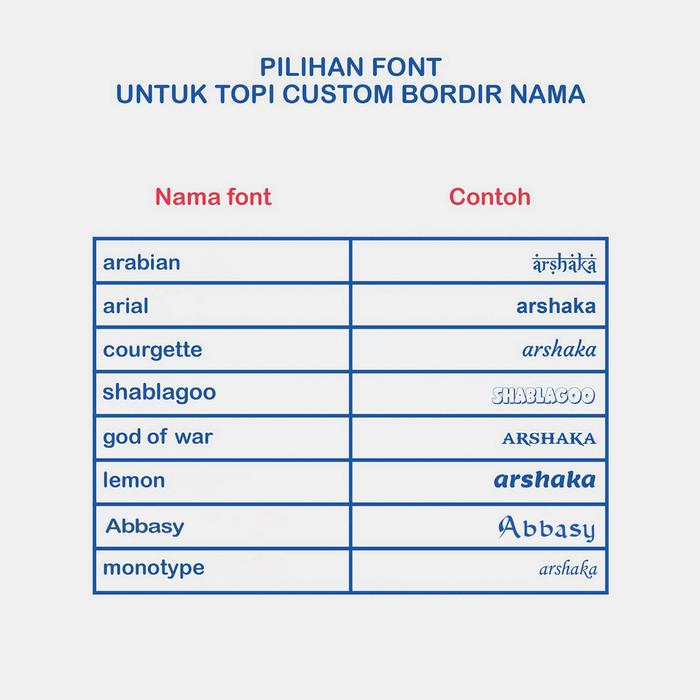 Tersedia dalam berbagai pilihan warna topi dan benang bordir, serta font yang lucu-lucu. Harga yang ditawarkan sudah sangat lengkap, termasuk topi dan jasa bordir nama. Cocok untuk bayi baru lahir hingga usia 2,5 tahun.