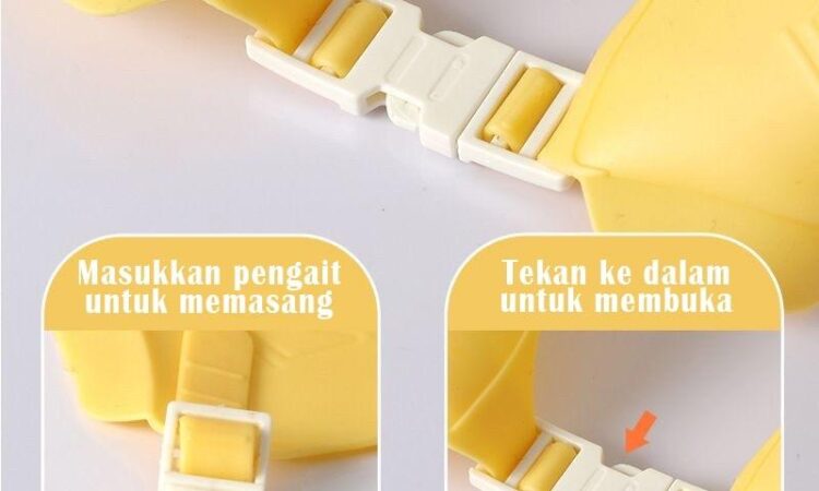 | Fitur Utama | 4 kancing penyesua ukuran kepala, clip belakang, dan desain anti-tetes. |