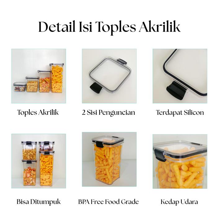 | Desain Transparan | Memudahkan Anda melihat isi toples tanpa perlu membuka tutupnya, sehingga lebih efisien dan terorganisir. |