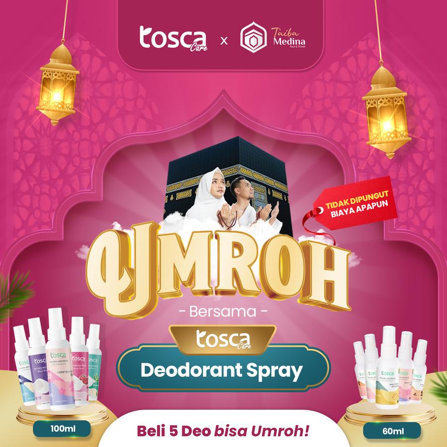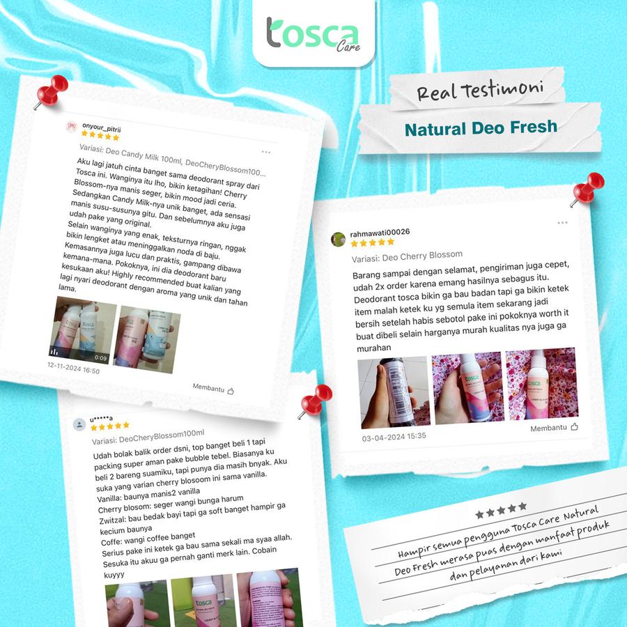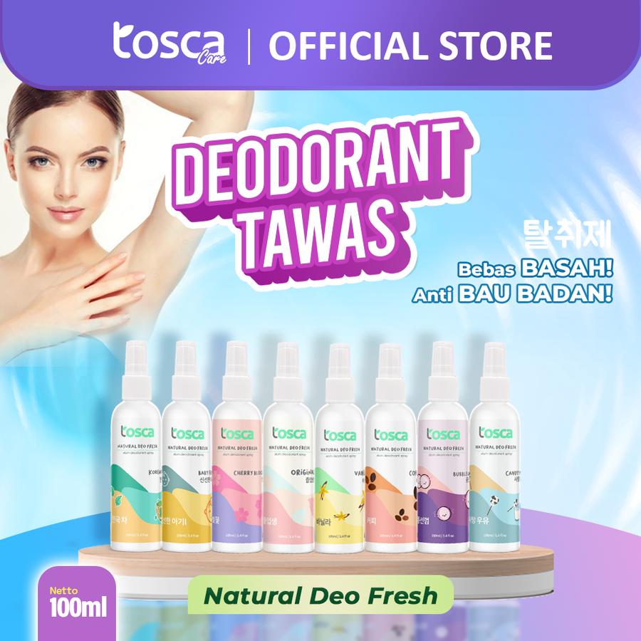 | Tosca Care Natural Deo Fresh (Step 1) | Deodorant spray berbahan tawas cair, non-alkohol, praktis, dan aman untuk kulit. | 1. Menghilangkan bau badan. 2. Mencegah ketiak hitam. 3. Mengontrol keringat berlebih. 4. Bebas alkohol. | 1. Semprot setelah mandi. 2. Pastikan ketiak kering. 3. Semprot 2-3x, tunggu hingga menyerap. | Natural, Men’s, Fruity, Moslem, Floral, Luxury, Baby Perfume. |