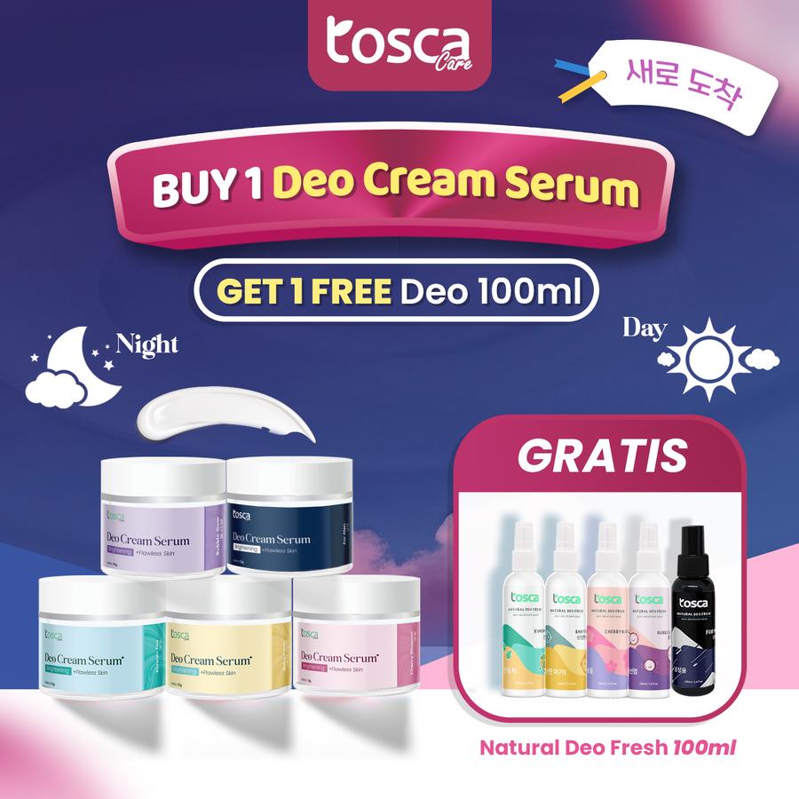 | Tosca Care Deo Cream Serum (Step 2) | Serum malam hari dengan niacinamide, glutathione, dan collagen untuk mencerahkan ketiak. | 1. Regenerasi sel kulit. 2. Mencerahkan kulit. 3. Melembapkan. 4. Aroma tahan lama. | 1. Oleskan pada ketiak bersih. 2. Pijat hingga meresap. 3. Gunakan 2x sehari (pagi & malam). | Baby Fresh, Cherry Blossom, Bubble Gum, Korean Tea, For Men. |