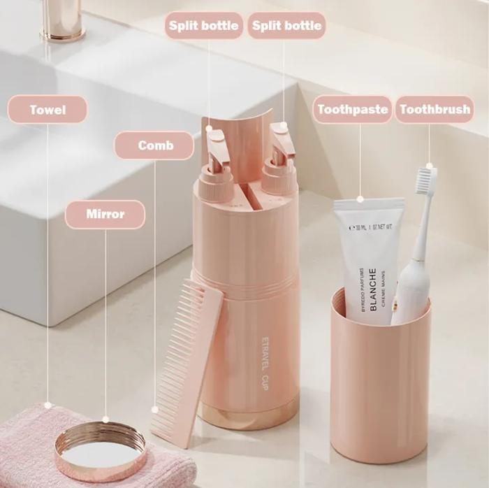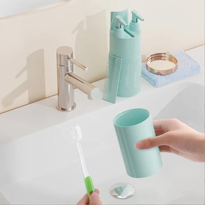 Nikmati fitur unggulannya: tutup atas berfungsi sebagai gelas kumur, dua pompa dengan sistem pengunci (pump lock) untuk mencegah kebocoran sabun dan shampoo (masing-masing kapasitas 60ml), slot penyisip sisir, kompartemen bawah yang menyimpan cermin dan handuk wajah. Semua dalam satu unit yang ringkas dan tumpah.