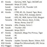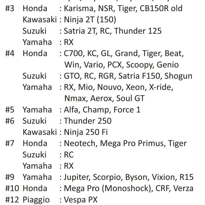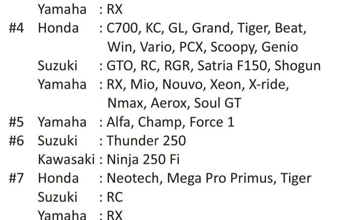 | Yamaha | RX-K, RX-S, RX-Z, Jupiter MX, Mio, Nouvo, Vega, Scorpio |