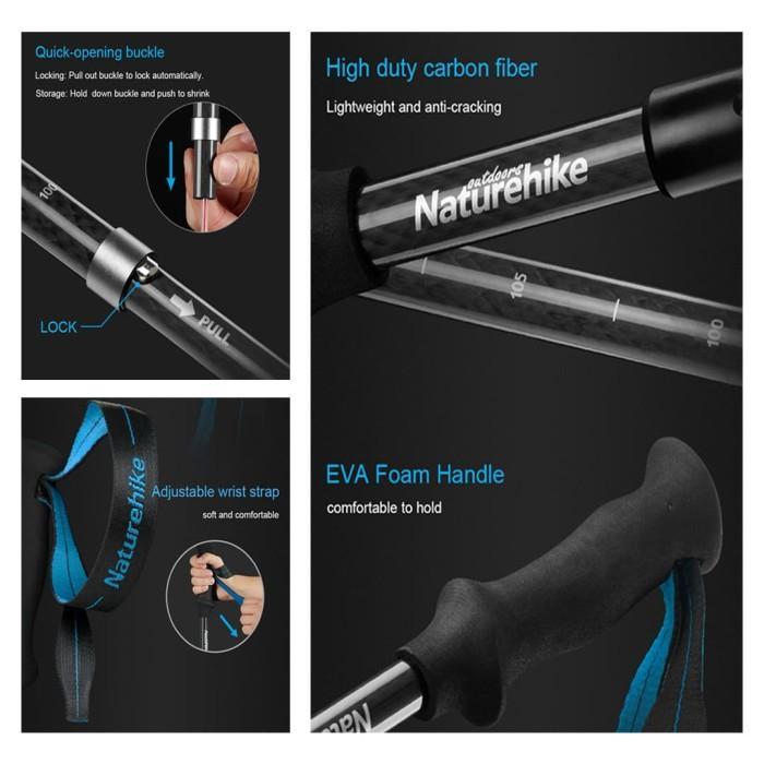 Tongkat trekking premium dari Naturehike dengan material serat karbon asli pada seluruh badan, menjadikannya sangat ringan namun tetap kokoh. Desain lipat Z-Shape memudahkan penyimpanan dan tidak memakan banyak ruang dalam backpack. Dilengkapi ujung tungsten steel dan mud support untuk performa optimal di medan berlumpur atau berpasir.