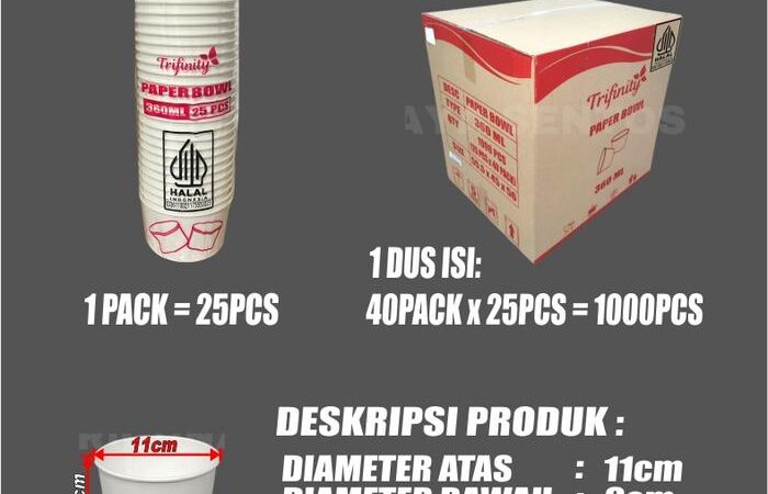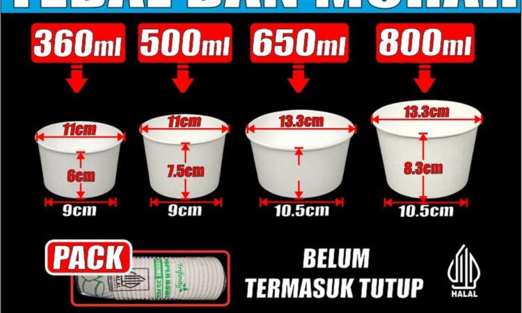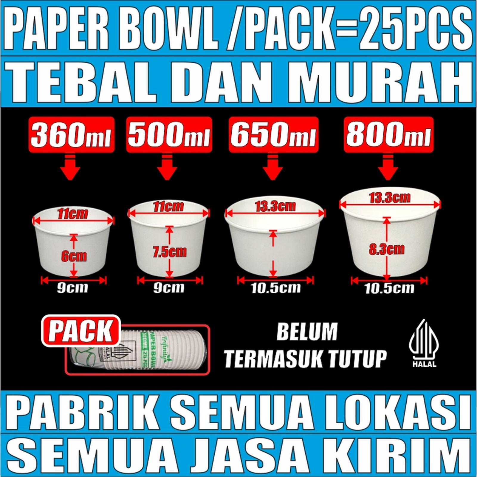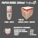 Dapatkan Paper Bowl berkualitas tinggi dari Trifinity untuk kebutuhan bisnis kuliner Anda. Tersedia dalam berbagai ukuran: 360ml, 500ml, 650ml, dan 800ml. Setiap kemasan berisi 25 pcs body bowl saja (tutup dijual terpisah).